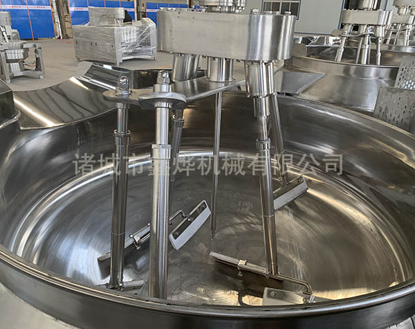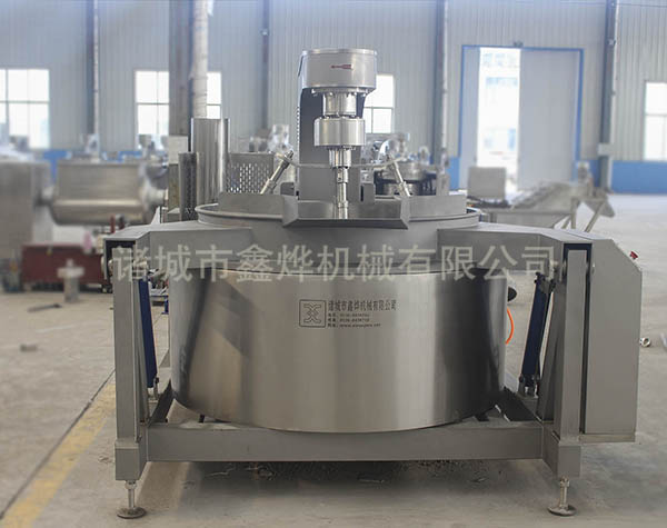 本設備有四頭攪拌、五頭攪拌和七頭攪拌,根據(jù)炒鍋容積和物料性質來決定攪拌頭的數(shù)量。無需人工翻炒,鍋體液壓傾斜高位自動出料,設備有專門的進料料斗,可以裝配乳化器。
